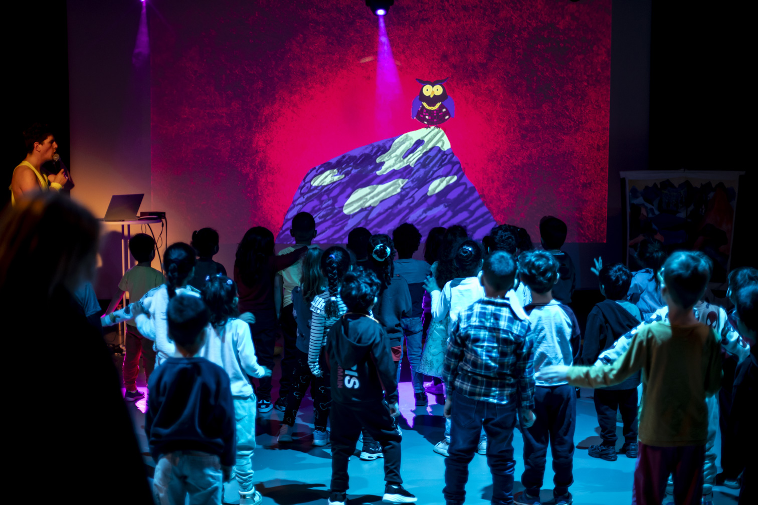 La dessinatrice Marianne Rulland enchante la boum de ses illustrations pour enfants, projetées en vidéo, pour nous encourager et nous aider de passer de niveau en niveau.